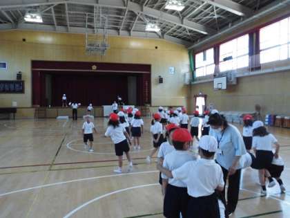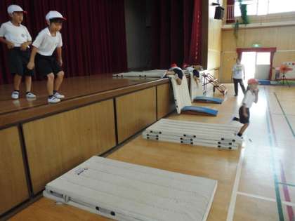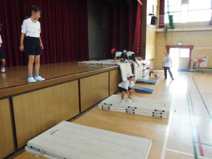 体育の学習。跳び箱の基本となる動きを身につける練習です。