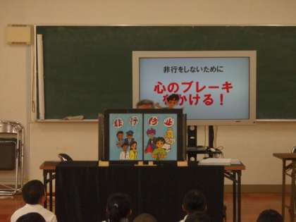 大阪府では非行の低年齢化を防ぐため、小学校高学年を対象に、非行の重大さに対する理解や犯罪に巻き込まれないための行動を啓発する「非行防止教室」を行っています。今日は、少年サポートセンターの協力を得て、5年生で実施しました。
