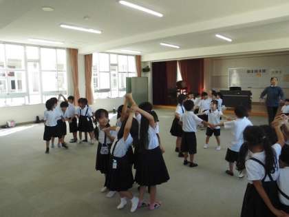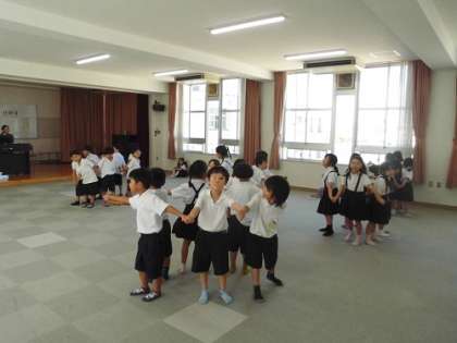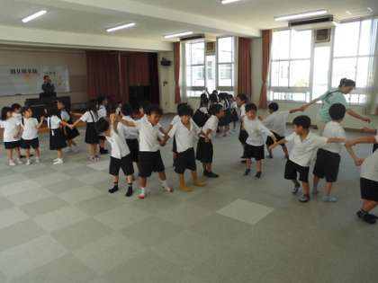 大きな第二音楽室で、ピアノに合わせ「なべなべそこぬけ」をしました。うまくひっくり返ろうと、友だちと息を合わせがんばっていました。人数が増えると、なかなか大変です。