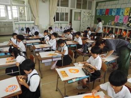 図画工作の学習です。みんなで育てたヒマワりを思い出し、パスでえがいています。