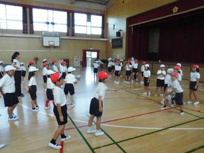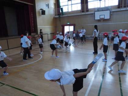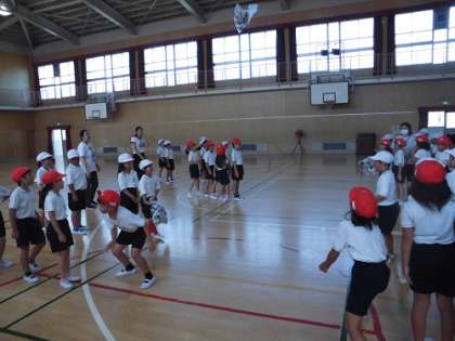 体育のネット型ゲームの学習です。新聞紙を詰めたビニル袋を使って、ボールを扱う基本的な動きを身に付けています。