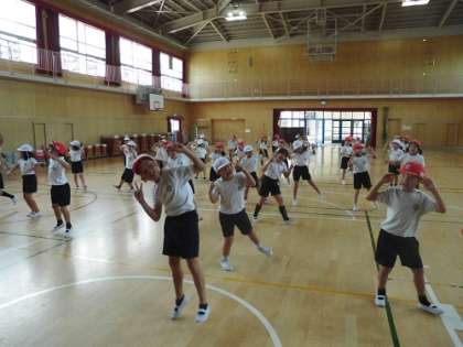 体育の学習。運動会に向けて団体演技の練習をしています。大きな掛け声と動きで、楽しく練習に励んでいます。