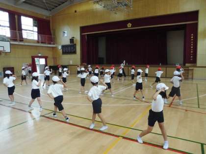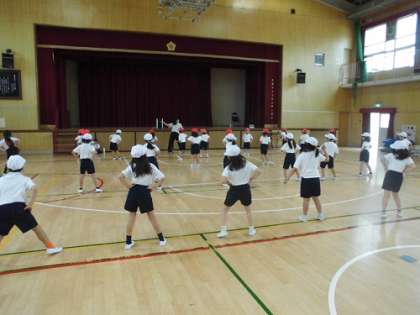 体育の学習です。運動会のダンスの練習です。軽快なリズムに乗り、大きな掛け声で練習に励んでいます。ノリノリで踊っていました。流れている曲は、皆さんもよくご存じのあの曲です。楽しみにしていてください。