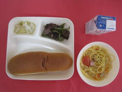鶏肉、ベーコン、たまねぎ、トマト、にんじん、ゆでたスパゲッティを使ったスープスパゲッティとキャベツのサワーソテーです。