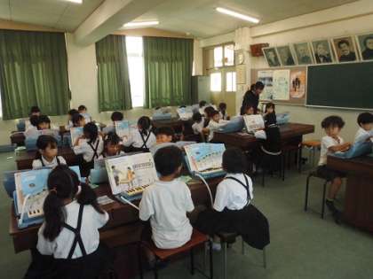 音楽の学習です。初めての鍵盤ハーモニカの学習です。音の出し方、指の使い方を学んでいます。