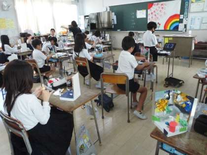 図画工作の学習です。「ミラクル!ミラーワールド」鏡に映る姿を考えながら作品を作っています。鏡の中で作品の世界が広がります。