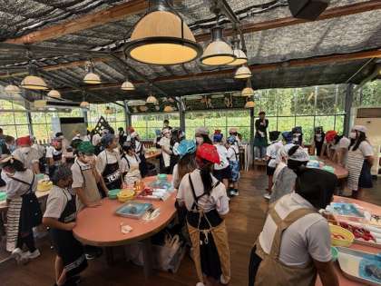 スタッフの人の説明をしっかりと聞き、班で協力してソーセージを作ります。