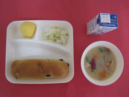 鶏肉、ベーコン、さつまいも、たまねぎ、にんじん、グリンピース、マッシュルームを使ったシチューです。