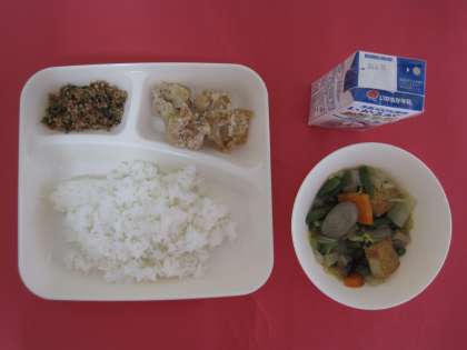 あつあげ、はくさい、にんじん、ごぼう、さんどまめ、しいたけを使った煮ものとかつおぶし、だいこん葉を使ったおかかなっ葉です。