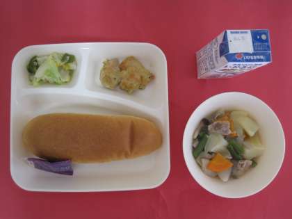 豚肉、じゃがいも、たまねぎ、にんじん、さんどまめ、しめじを使ったスープ煮とキャベツ、コーン、ピーマンを炒め、塩、こしょう、ウスターソースで味つけした野菜のソテーです。
