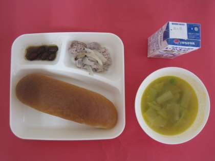 鶏肉、キャベツ、だいこん、にんじん、グリンピースを使ったスープとうずら豆のグラッセです。
