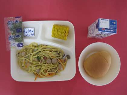 ウインナー、ベーコン、たまねぎ、にんじん、ピーマン、しいたけ、しめじを炒め、ゆでたスパゲッティを加えてさらに炒め、塩、こしょう、薄口しょうゆ、濃口しょうゆで味つけしたスパゲッティです。きざみのりをかけて食べました。