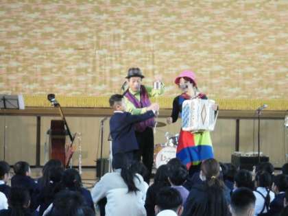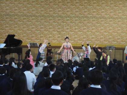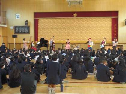 アンサンブル・レネットさんによる音楽鑑賞会がありました。手作りの楽器での演奏があったり、声も楽器と、「猫の鳴き声」で高い音や低い音などの発声の仕方を教えてもらったりしました。