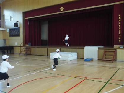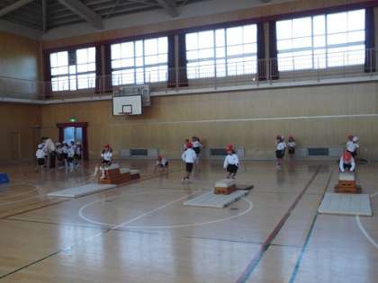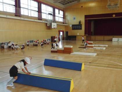 体育の「跳び箱」の学習です。跳び箱につながる動きを身につけるため、いろいろな場を設け練習に励んでいました。