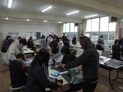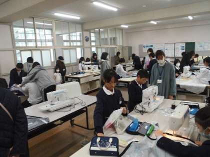 学級休業のため延期になっていた学習参観・懇談会を28日(木)に実施しました。家庭科の「ミシンで楽しいソーイング」の学習でした。ミシンを上手に操りエプロンを縫っていました。