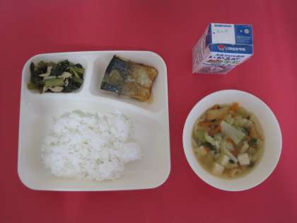 とうふ、うすあげ、キャベツ、たけのこ、にんじん、青ねぎを使った五目汁とこまつなの煮びたしです。