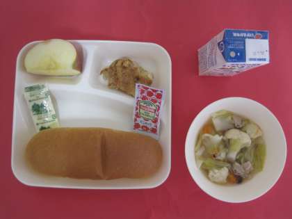 季節のカリフラワーの他に豚肉、キャベツ、にんじん、しめじを使ったスープ煮と季節のりんごです。