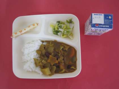 豚肉、じゃがいも、金時豆、たまねぎ、にんじんを使ったカレーライスです。