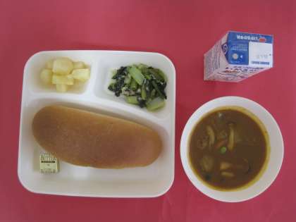 にくだんご、たまねぎ、だいこん、にんじん、むきえだまめ、しめじを使ったカレー味の煮ものです。