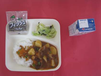 牛肉、じゃがいも、たまねぎ、にんじん、グリンピース、セロリを使い、ケチャップ、トマトピューレ、砂糖、塩、こしょう、ローレル、トンカツソース、ウスターソース、濃口しょうゆ、チキンブイヨンで味つけし、水どき上新粉でとろみをつけたハヤシライスです。