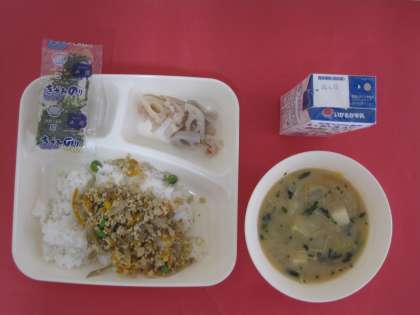 豚肉、とうふ、はくさい、たまねぎ、だいこん葉を使ったみそ汁と焼きれんこんです。