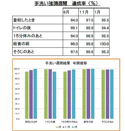 本校では、手洗い強調週間を6・11・1月の3回実施しています。先月で今年度の取り組みが終了したので、1年間の達成率をまとめました。