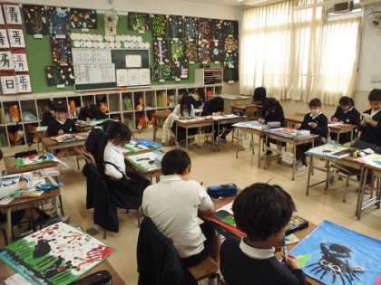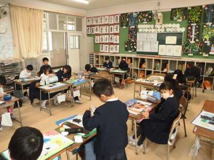 図画工作の学習です。紙版画に背景をつけ、作品を完成させています。タイトルをつけ、工夫したところをふり返っています。