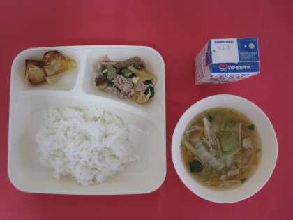 鶏肉、はくさい、たまねぎ、にんじん、みつば、えのきたけを使った五目汁と焼きじゃがです。