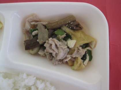 干しずいきは、さといもの葉と茎をつないでいる部分の皮をむいて、水にさらした後、乾燥させたもので、もみ洗いしたあと、ぬるま湯でもどして使います。その干しずいきの他、豚肉、うすあげ、青ねぎを炒め煮し、みそ味で煮含めた豚肉と干しずいきのみそ煮です。