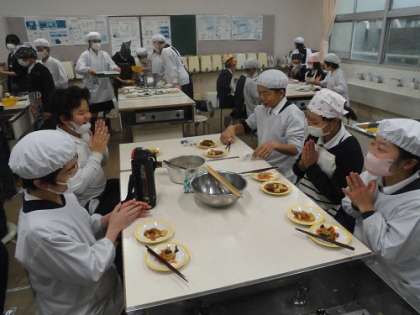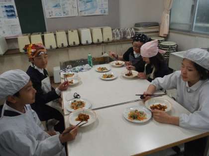 出来上がった料理をみんなで美味しくいただきました。とても上手に出来たようです。ご家庭でも、作ってもらってみてください。