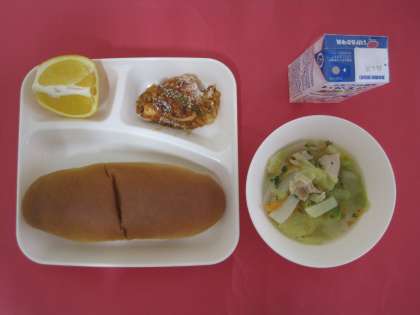 鶏肉、じゃがいも、キャベツ、だいこん、にんじん、パセリを使ったスープとはっさくです。