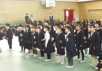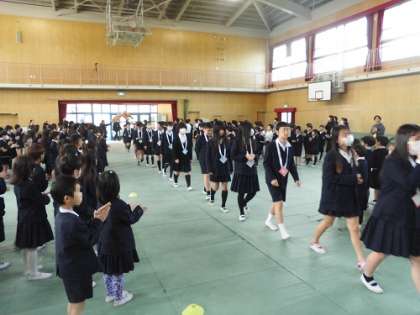 今日(3月6日)、卒業を祝う会がありました。1年生からもらったメダルを首にかけ、拍手で迎えられて入場しました。その後、各学年から呼びかけや合唱、合奏のプレゼントがありました。