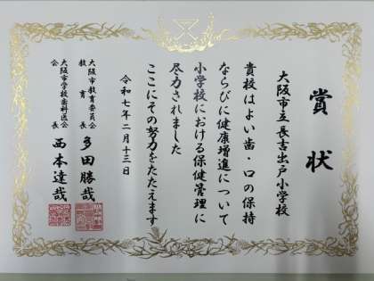 今年度もよい歯の表彰を受けました。学校での歯に関する取り組みや、むし歯の罹患率、歯科医院への受診率などを総合的に評価され送られる賞です。
