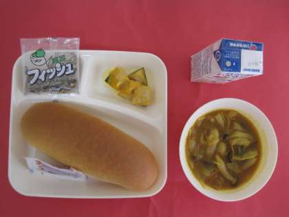 かぼちゃに野菜ブイヨン、ノンエッグドレッシングで下味をつけて焼いたかぼちゃのマリネ焼きとミニフィッシュです。