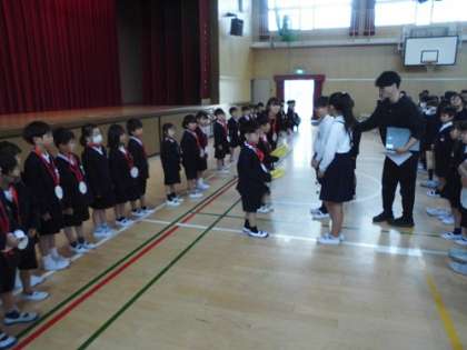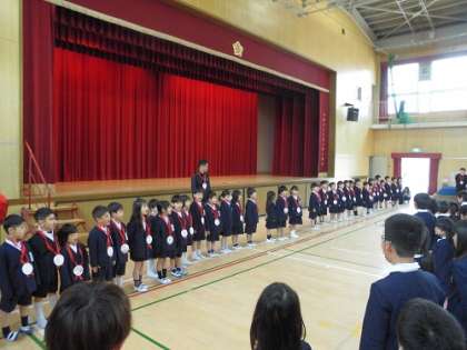 在校生代表からは「長吉出戸小学校へようこそ!」という温かい歓迎の言葉が贈られ、新入生たちは少し緊張しながらも、元気いっぱいにお礼のあいさつをしてくれました。校歌の紹介や、学校生活についての簡単な説明も行われました。