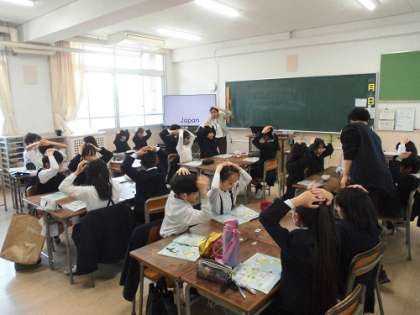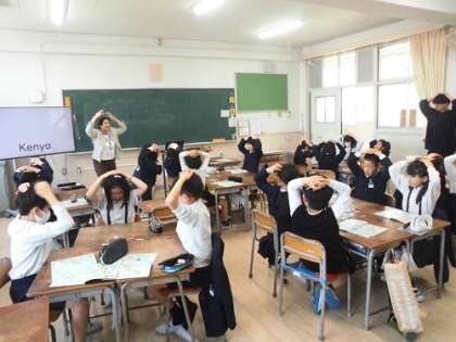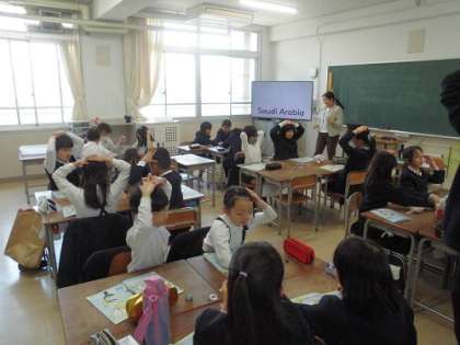 外国語活動の時間です。新たに来られたC−NETの先生と一緒に楽しく活動しています。世界のいろいろな国のあいさつの学習しています。