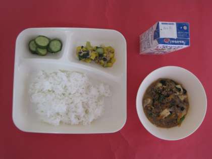 しょうがとにんにくを香りよく炒め、牛ひき肉、豚ひき肉、とうふ、たまねぎ、にんじん、にらを炒め、トウバンジャン、塩、濃口しょうゆ、赤みそで味つけし、水どきでんぷんでとろみをつけたマーボーどうふです。