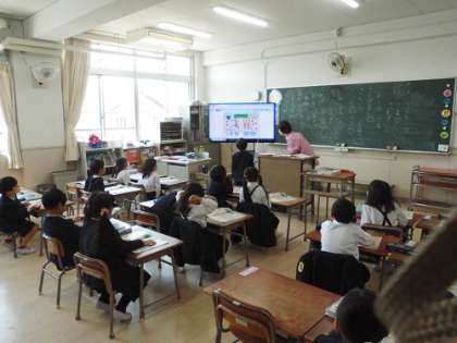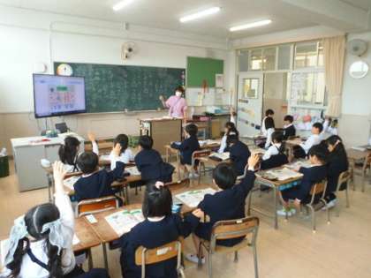 算数の「なかまづくりとかず」の学習です。同じ数てなかまづくりしているものを探してます。みんな発表したくて、元気に手を挙げていました。