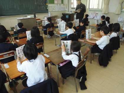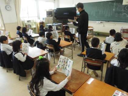 国語の学習です。「よろしくね」をよい姿勢で、先生の後に続いて元気に音読していました。
