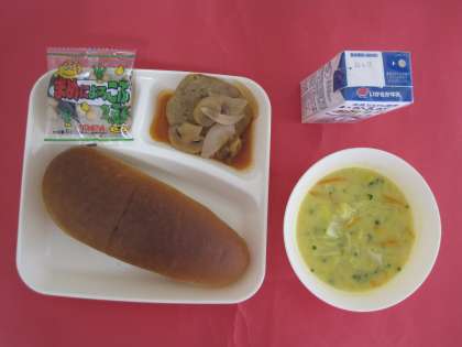 キャベツ、コーンペースト、コーン、にんじん、パセリを使ったスープと豆こんぶです。
