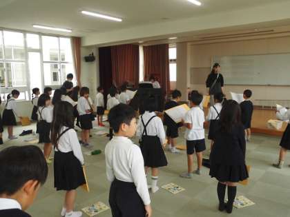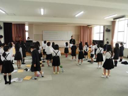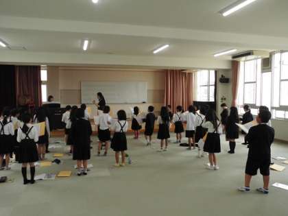 学年で音楽の学習をしています。4階の第二音楽室で子ども達の元気でのびやかな歌声が響き、1階の職員室までとどいていました。