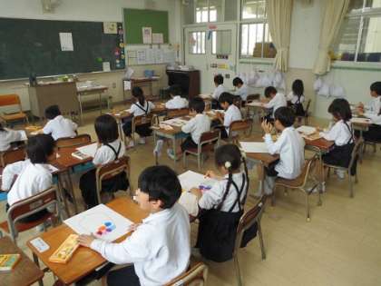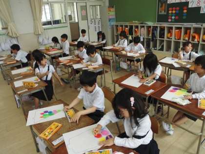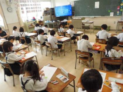 図画工作の学習です。パスの練習です。この前に、パスで線を引く練習をしました。今日はぬりつぶしです。ビンの中に入っている飴玉をぬっています。色から味を想像しながらぬっています。