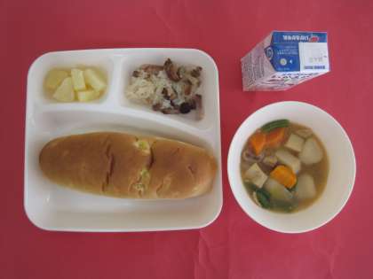 まる天、鶏肉、たまねぎ、たけのこ、にんじん、さんどまめをしょうがの香りを出した綿実油で炒めて湯を加えて煮、塩、濃口しょうゆ、中華スープの素で味つけし、最後に水どきでんぷんでとろみをつけたうま煮と缶詰のパインアップルです。