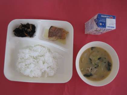 豚肉、じゃがいも、たまねぎ、キャベツ、こまつな、しめじを使ったみそ汁とうすあげ、にんじん、ひじきを炒め、だしを加えて煮、砂糖、濃い口しょうゆで味つけしたひじきのいため煮です。