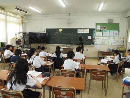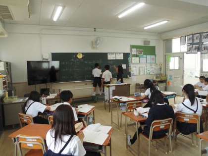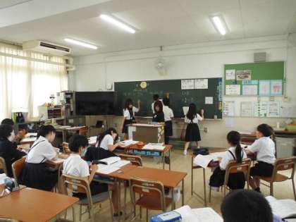 算数、分数のかけ算の学習をしています。約分に気をつけ、次々と問題を解いています。