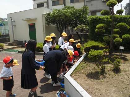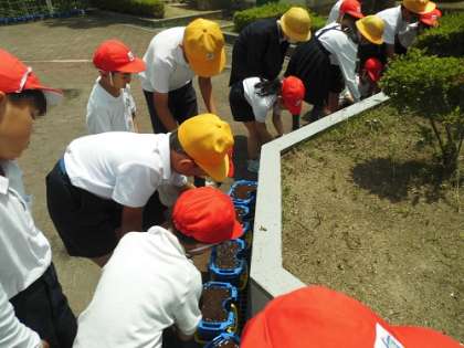 種をうまいた後、陽の当たる場所に移動させ、水をたっぷりやっていました。1年生にとっては6年生と一緒に活動したので、楽しくスムーズに出来たようです。芽が出てくるのが楽しみです。
