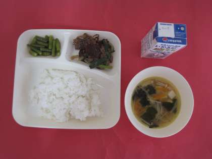 焼き豚、とうふ、にんじん、もやし、えのきたけ、わかめを使ったスープとさんどまめのナムルです。