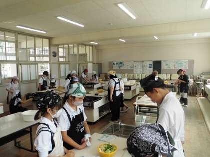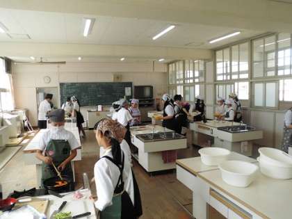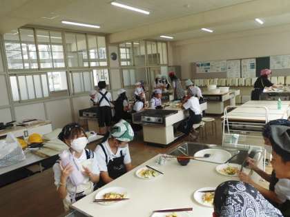 家庭科の調理実習です。今日は2組が行いました。手際よく野菜を切り、炒めていました。卵料理も出来上がり、みんなで美味しくいただきました。