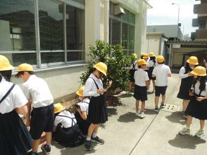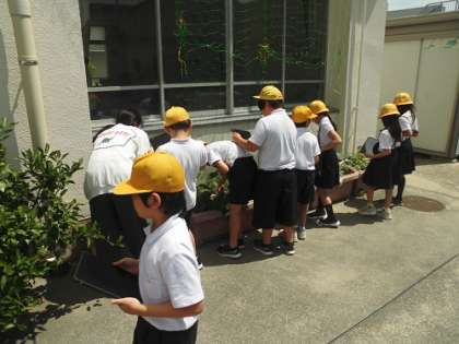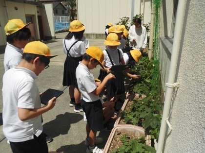 理科の学習です。ヘチマとヒョウタンの観察をしています。タブレットで写真を撮って記録し、成長の様子を調べています。
