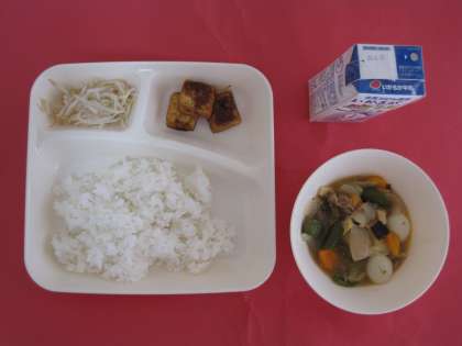 豚肉、うずら卵、キャベツ、たまねぎ、にんじん、たけのこ、ピーマン、しいたけを使った八宝菜です。卵にアレルギーのある児童は、うずら卵を入れる前に取り分けたものを食べました。